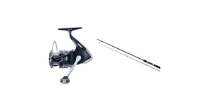 Pack de pêche de spinning de la marque Shimano, consistant en Canne FX XT Modéré Rapide 2,40m y Moulinet Catana FE 2500 HG, spécial pour la pêche à l'achigan et aux carnassiers.