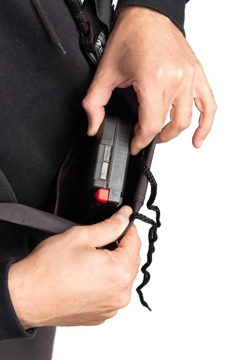 - Grande poche poitrine et cordon de serrage : rangement pratique pour les objets essentiels tout en garantissant un bon maintien.