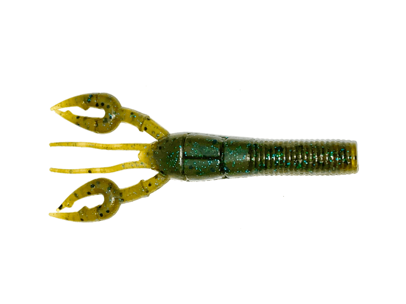 Leurre souple en forme de crabe de 95 millimètres de la marque Yamamoto modèle Fat Baby Craw, en couleur vert avec des rayures bleues, spécialement pour la pêche au Black Bass.