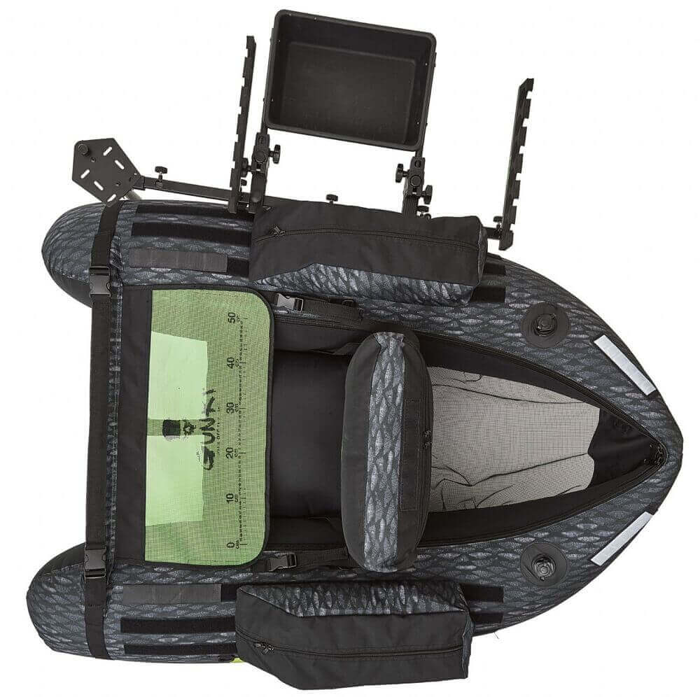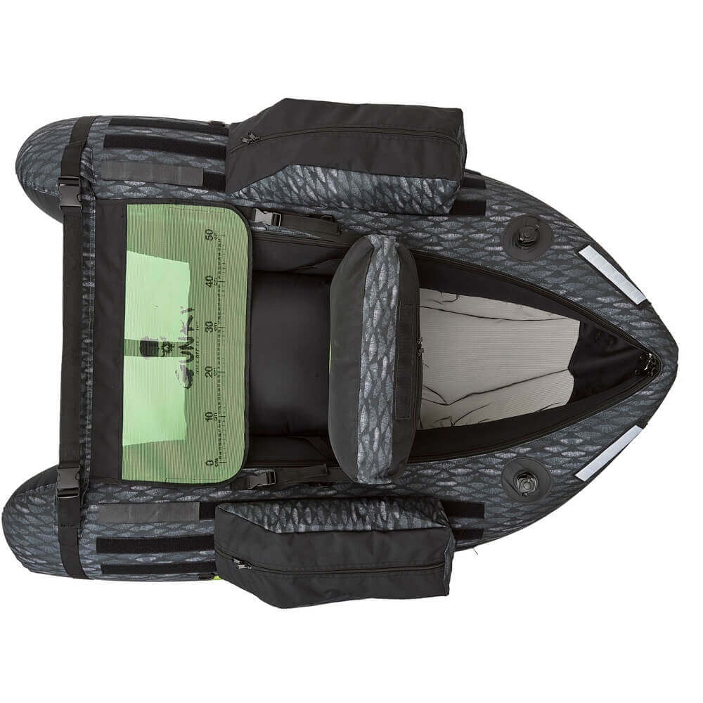 Float tube de la marque Gunki modèle Furti-V en couleur gris, noir et vertspécial pour la pêche au black-bass et aux carnassiers.