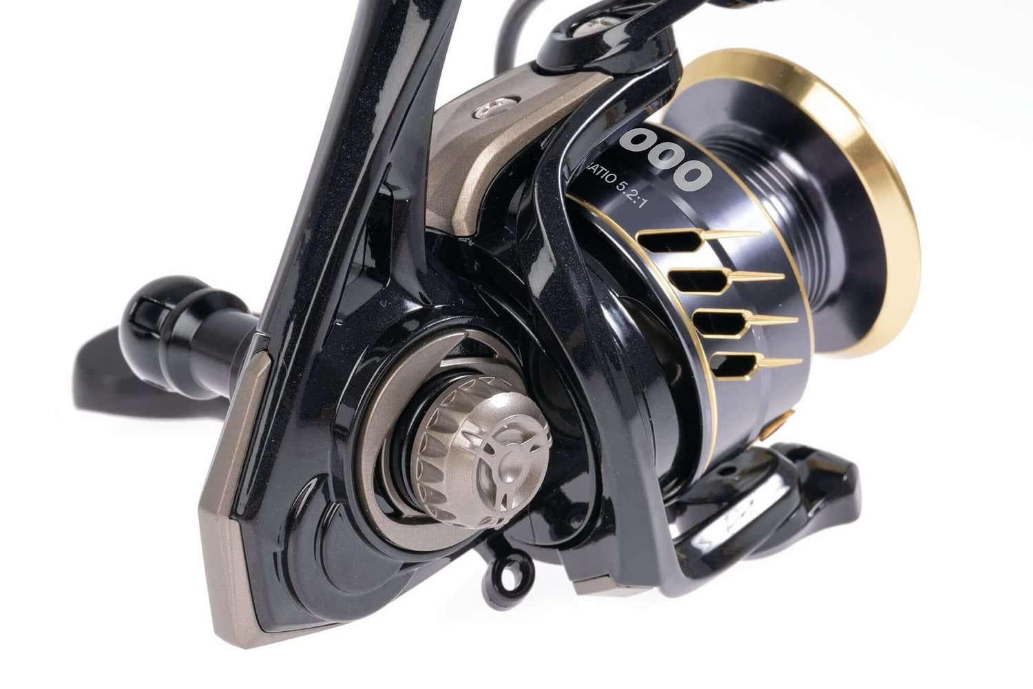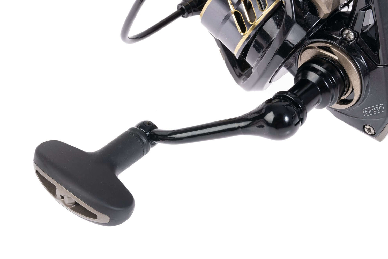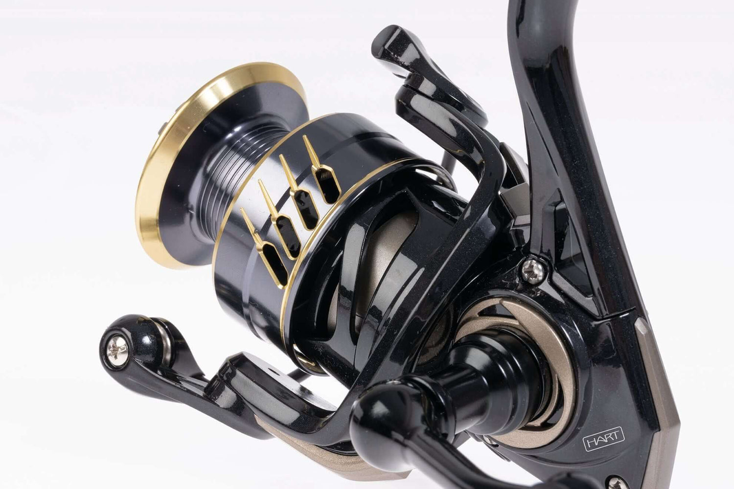 Moulinet de spinning de la marque Hart modèle Fiamma, en couleur noir et or, spécial pour la pêche au black-bass et aux carnassiers.