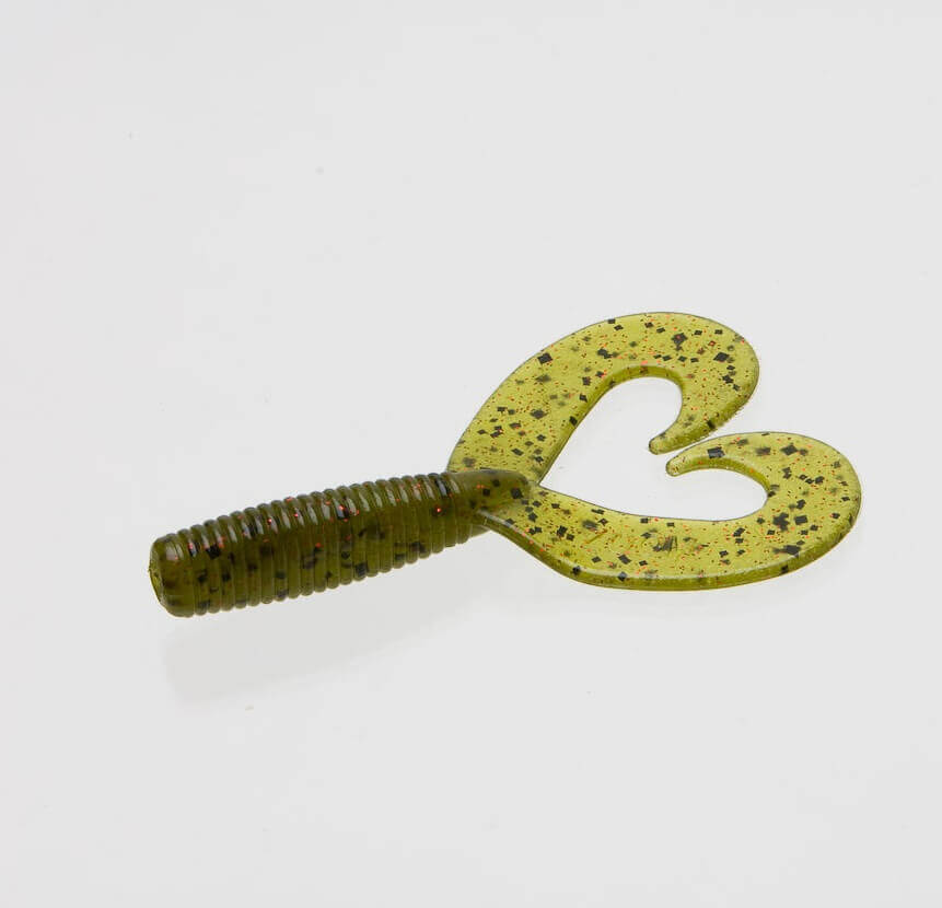 Leurre souple en forme de ver de corps gras et ondulé avec deux queues larvaires de 90 millimètres de la marque Zoom modèle Gros Albert Twin couleur vert avec des bandes rouges et noires. Il est imprégné de sel. Contient une action de spinning à deux queues pour déplacer beaucoup d'eau. Les deux queues frisées créent une action de battement et un appel des bars lorsqu'ils touchent l'eau. Conçu pour une remorque de jig ou comme trailer sur un spinnerbait ou d'un buzzbait.