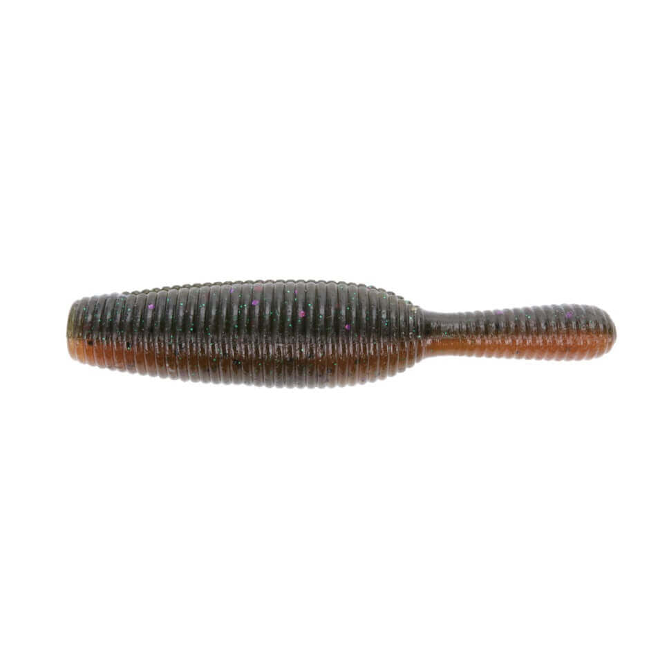 Leurre souple en forme de ver 63,5 mm de la marque Yamamoto modèle Yamatanuki en couleur marron avec des taches violet et vertspécial pour la pêche au black-bass et aux carnassiers.