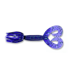 Leurre souple de 127 mm de la marque Yamamoto modèle Double Tail Hula Grub couleur violet avec des taches noires et vertes, spécial pour la pêche au black-bass et aux carnassiers. Il se caractérise par son double mouvement de queue et ses franges, idéales pour les montages de différentes manières. Grâce à sa forme unique, ce Leurre souple reste sur le fond et fournit beaucoup d'action.