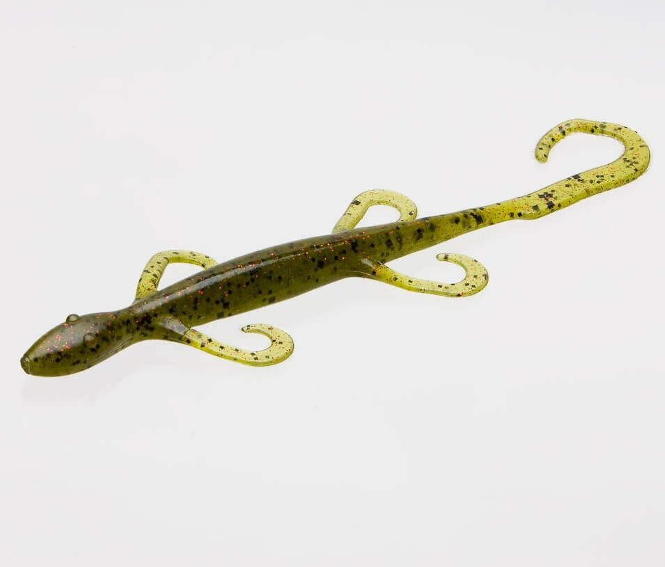 Leurre souple en forme de lézard de 203 millimètres de la marque Zoom modèle Lézard Magnum en couleur vert avec des rayures rouges et noires. C'est un lézard au corps élancé, aux pattes libres et à la queue frisée. Il est imprégné de sel.