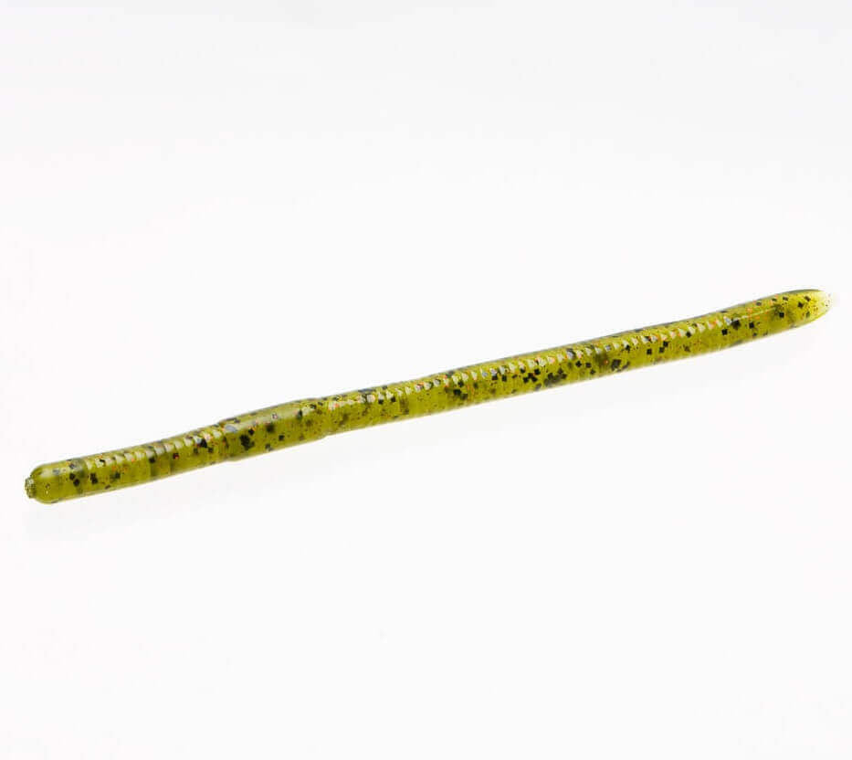 Leurre souple en forme de ver fin de 139 millimètres de la marque Zoom modèle Swramp Crawler en couleur vert avec des bandes noires et rouges. Il s'agit d'un ver mince, à queue droite, qui se tortille naturellement. Il est imprégné de sel.