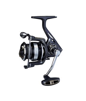 Moulinet de spinning de la marque Gunki, modèle Escouade FV 400, en couleur noir, argent et or, spécialement pour la pêche à l'achigan.