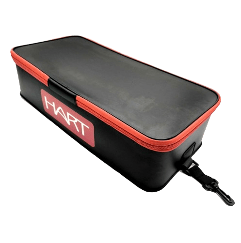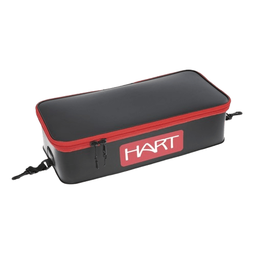 Sac semi-rigide de la marque Hart avec des séparations noires et rouges, spécial pour la pêche au bar et aux carnassiers.